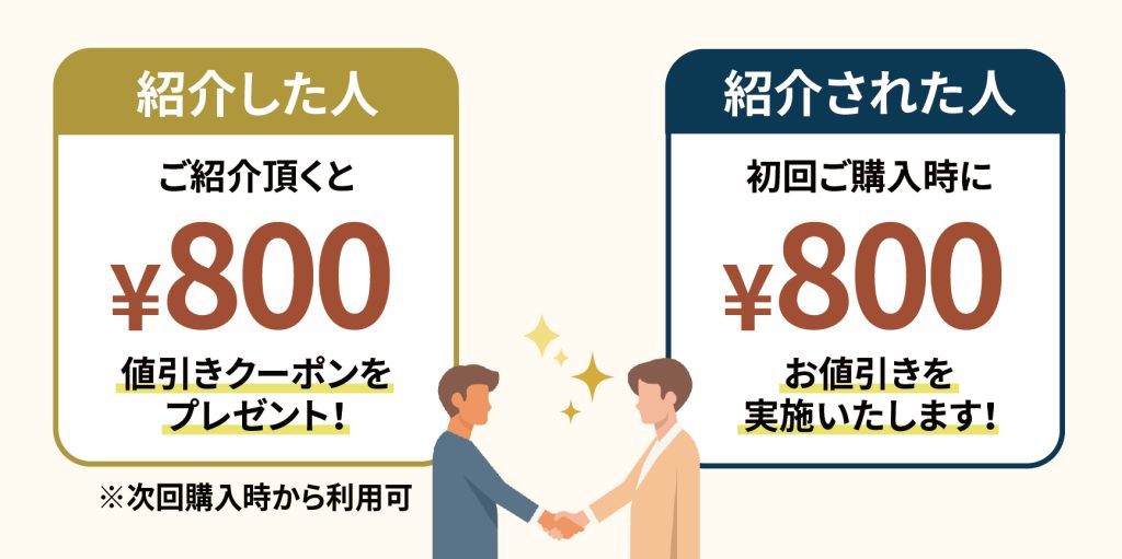 紹介された方が、RIZOIL商品をご購入する際、備考欄にご友人のお名前と住まいの都道府県を記載すると、初回購入時に800円(税込)のお値引きを実施いたします。