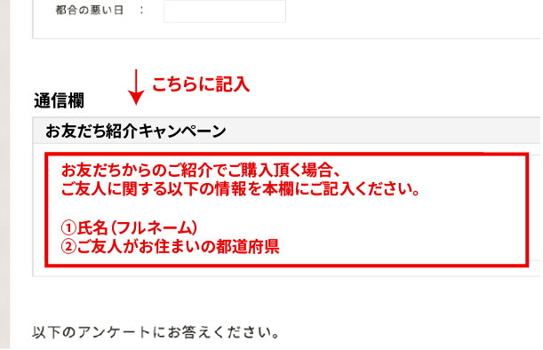 ご購入時に「紹介者様のお名前」「お住まいの都道府県」を、カートの以下の箇所に記載ください。